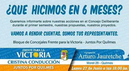 Será el próximo lunes 27 de junio a las 18 en la agrupación «Arturo Jauretche», de Carlos Morel 26 donde los integrantes del bloque explicarán todas las iniciativas presentadas en estos primeros 180 días, las aprobadas y las que aún están en estudio.