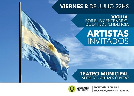 El viernes 8 de julio se realizará, a partir de las 22, la “Vigilia del Bicentenario” en el Teatro Municipal (Mitre 721). Habrá una exposición de fotografías históricas y una muestra de carruajes en miniatura. A su vez, se presentará la orquesta de tango “Ciudad de Quilmes”, Julio Urruty y las guitarras del IFA, y el grupo folclórico quilmeño “Los Lugareños”.