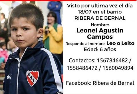 Se llama Leonel Agustín Campos y tiene 6 años. Fue visto por última vez el lunes.