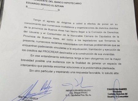 Por medio de dos escritos, el presidente del bloque de diputados bonaerenses del FPV-PJ, Walter Abarca, junto a las diputadas Eva Ramírez y Valeria Amendolara solicitaron hoy una audiencia a la brevedad al Director Ejecutivo de la ANSES, Emilio Basavilbaso, y al titular del Banco Hipotecario, Eduardo Elsztain, con la finalidad de generar un espacio de intercambio que permita encontrar soluciones a las problemáticas vinculadas con el Programa de Crédito Argentino conocido como Procrear.