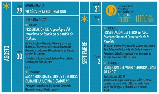 En el marco de los festejos, el próximo lunes se inaugurará la muestra «20 años de la Editorial UNQ» en la Galería Rosa de los Vientos (Roque Saénz Peña 352, Bernal) mientras que al día siguiente se realizará a las 18 la presentación de la obra «Arqueología del terrorismo de Estado en el partido de Quilmes del Observatorio Memoria, Género y Derechos Humanos», con la participación de Lila Mannuwal, Luciano Grassi, María Sonderéguer y Mario Lozano.