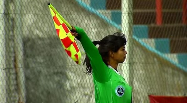 La jueza de línea María Eugenia Rocco recibió un golpe en la nuca que le propinó el jugador Emmanuel Frances, de Deportivo Merlo.
