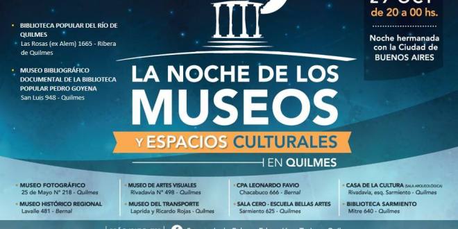 Con el apoyo del gobierno de Martiniano Molina, La Noche de los Museos de Quilmes estará hermanada,por primera vez, a la ya tradicional noche de la Ciudad de Buenos Aires. En esta oportunidad, se suman al evento los museos y espacios culturales municipales Museo Histórico Fotográfico Municipal, Museo Histórico Regional Alte. Brown, Museo de Artes Visuales Víctor Roverano, Museo del Transporte Hillner Decoud, Biblioteca Pública y Municipal Domingo F. Sarmiento, Casa de la Cultura, Centro de Producción Audiovisual Leonardo Favio, el Espacio Cero de la Escuela Municipal de Bellas Artes Carlos Morel. Asimismo, participarán la Biblioteca Popular del Río de Quilmes y el Museo Bibliográfico Documental de la Biblioteca Popular Pedro Goyena.