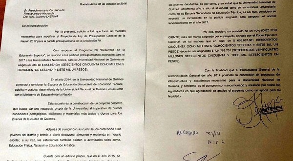 En relación a las partidas presupuestarias asignadas para el año 2017 a las Universidades Nacionales, el pedido de la Diputada significaría un incremento del 10% al monto asignado por el Poder Ejecutivo Nacional, por consiguiente, de ser considerado el pedido e incorporado, se pasaría de $658.867.001 a $724.753.701 para la finalización de las obras en la Escuela de Educación Secundaria Técnica de la UNQ. “En el año 2015 se había finalizado el primer tramo de sus obras y ahora es necesario finalizar la etapa de construcción y continuar con su crecimiento”, explicó Mendoza.