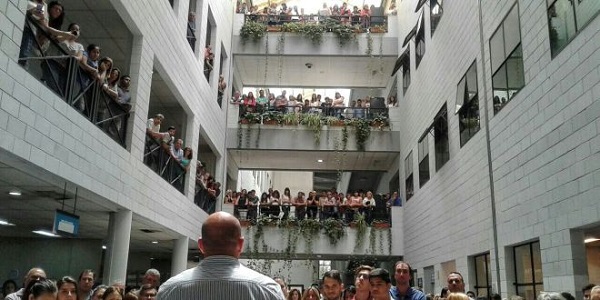 Acompañado de su gabinete, Martiniano Molina bajó de su despacho por la rampa, intercambio saludos con los trabajadores para luego, micrófono en mano, brindar un mensaje.
