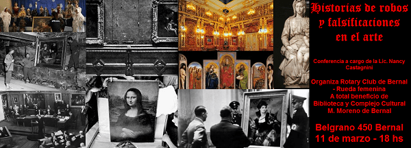 El 11 de marzo, la licenciada en Historia Nancy Castagnini realizará la conferencia «Historia de robos y falsificaciones en el arte», organizada por la rueda femenina del Rotary de Bernal y a total beneficio de la Biblioteca Mariano Moreno.