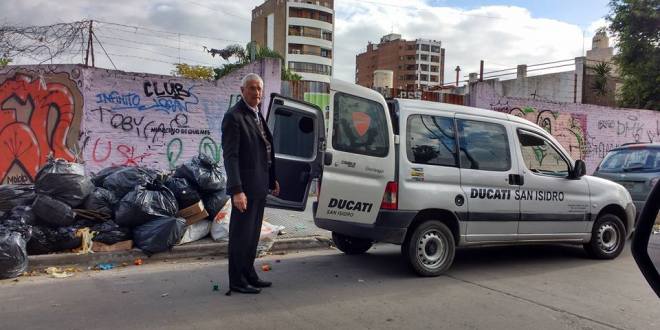 En las fotos puede verse como un hombre desciende de una camioneta Berlingo ploteada con la leyenda «Ducati San Isidro», abre la puerta trasera y comienza a sacar gran cantidad de bolsas de consorcio.
