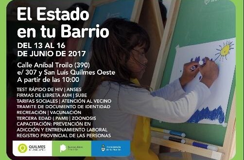El Municipio de Quilmes informa a los vecinos que del 13 al 16 de junio, a partir de las 10, se desarrollará una nueva jornada del programa nacional El Estado en tu Barrio, en 390 (calle Aníbal Troilo) y San Luis, Quilmes Oeste.