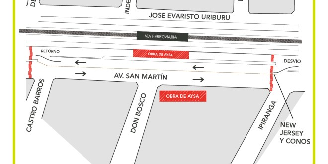 Desde la fecha y por tiempo indeterminado, la avenida San Martín entre las calles Ipiranga y Castro Barros tendrá desvío de tránsito sentido sur (Quilmes) – norte (Capital Federal).