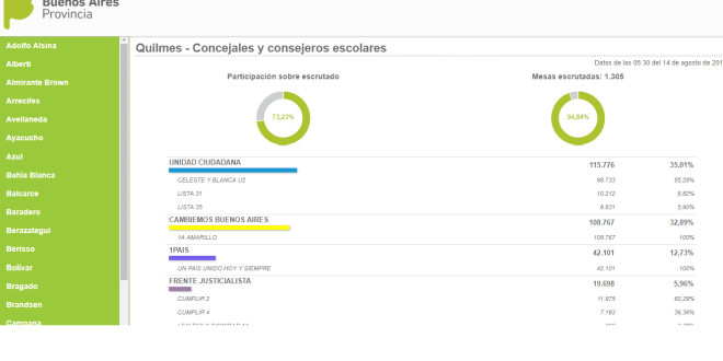Con 1.305 mesas escrutadas, Unidad Ciudadana obtuvo en Quilmes 115.776 votos (35,01%) y Cambiemos, en segundo lugar 108.767 (32.89%).
