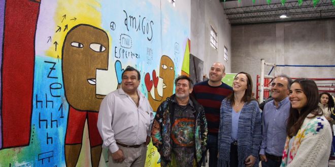 En su visita, María Eugenia Vidal asistió con Molina a la celebración por el Día del Libro realizada en el gimnasio Ringo del barrio La Unión. Compartió la mañana con los chicos y familias del lugar, y leyó un cuento para ellos junto a Juana Viale.
