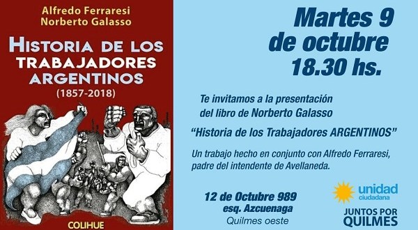 El historiador Norberto Galasso presentará en Quilmes su libro «Historia de los trabajadores argentinos» escrito conjuntamente con Aldredo Ferraresi, padre del actual intendente de Avellaneda, fallecido hace poco tiempo.