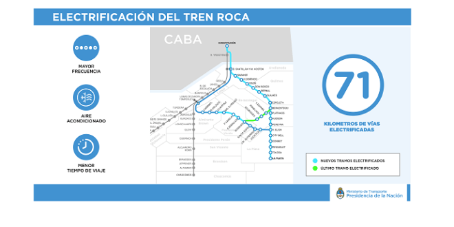 En el tren Roca el Gobierno Nacional están llevando adelante obras de infraestructura a cargo del Ministerio de Transporte de la Nación: ya se llevan electrificados 71 kilómetros de vías y más de 750 millones de dólares de inversión, además de la puesta de valor de Constitución.