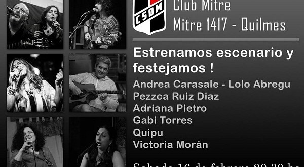 A partir de las 20:30 horas actuarán Andrea Carassale y Lolo Abregu, Pezzca Ruiz Díaz, Adriana Prieto, Gabriel Torres, Quipu y Victoria Morán, todos ellos celebrando solidariamente la inauguración del nuevo escenario del club y sus permanentes mejoras edilicias.