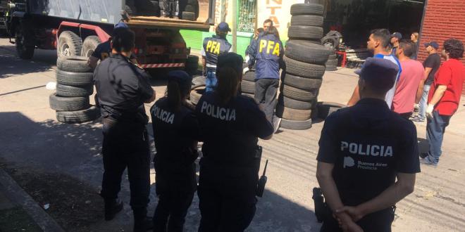 Los procedimientos comenzaron ayer y se extendieron hasta hoy, que la calle Boedo estuvo bloqueda al tránsito ya que un camión fue apostado en el lugar para cargar gran cantidad de neumáticos cuyo origen es dudoso.