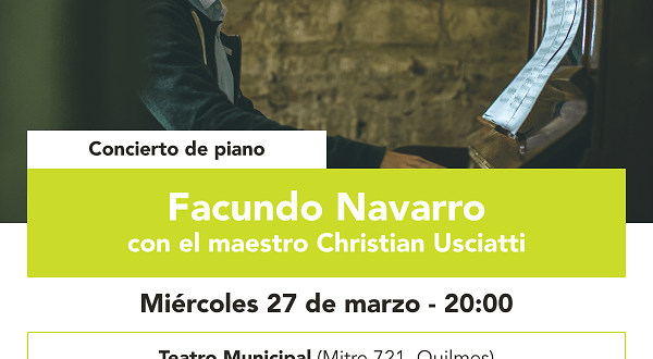 La Secretaría de Cultura y Educación del Municipio de Quilmes, invita a disfrutar del concierto gratuito que realizará el joven pianista Facundo Navarro, acompañado también por el reconocido maestro Christian Usciatti, el 27 de marzo, a las 20.00, en el Teatro Municipal (Mitre 721).