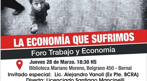 Este jueves 28 de marzo en la Biblioteca Mariano Moreno de Bernal iniciará su ciclo 2019 el Foro Trabajo y Economía. Como invitado especial contará con la presencia del académico y economista Alejandro Vanoli (ex Pte. Banco Central) y también expondrá el Lic. Santiago Mancinelli para analizar “La economía que sufrimos” y proponer caminos de salida de la situación socio económica actual.