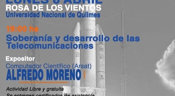 El próximo lunes 8 a las 19 horas se realizará la charla “Soberanía y desarrollo de las telecomunicaciones” en la Universidad Nacional de Quilmes a cargo de Alfredo Moreno, computador científico de la empresa satelital estatal argentina ARSAT.