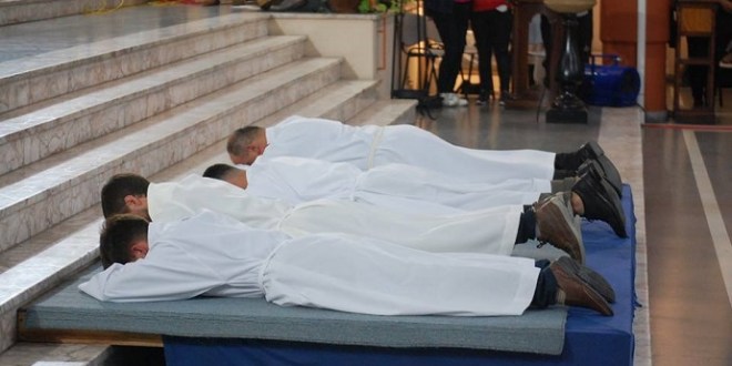 El Padre Obispo Tissera dijo en su homilía a los recién ordenados: el diaconado se ve enriquecido al elegir una vida célibe, al estilo de Jesús. Esto nos lleva a ser personas de profunda fe que va de la mano de la humildad, pero no menos de la mano del amor. Ser célibe no significa menos amor, sino un amor grande y generoso como respuesta a Jesús que nos llama a seguirlo, dando la vida con alegría y sencillez en lo cotidiano. Amor a la gente concreta, a quien se presenta en nuestro camino, no buscándonos a nosotros mismos, sino ayudando que los demás se encuentren con Jesús a quién anunciamos y hacemos presente con nuestro sacramento.”