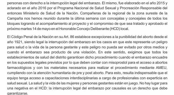 El Código Penal de la Nación en su Art. 86 establece excepciones a la punibilidad del aborto desde el año 1921, siendo legal la interrupción del embarazo en los casos en que este represente un peligro para salud o la vida de la persona gestante y este peligro no pueda ser evitado por otros medios y cuando el embarazo sea producto de una violación. En este sentido, exigimos que todos los establecimientos de salud del distrito garanticen dicho procedimiento cuando el embarazo encuadre en los supuestos legales previstos por lo que deben contar con misoprostol para el acceso a abortos farmacológicos y con los materiales necesarios para realizar el procedimiento mediante AMEU, cumpliendo con la atención humanitaria de pre y post aborto. Para esto, resulta indispensable que el equipo tenga acceso a capacitaciones interdisciplinarias a cargo de profesionales con experticia en salud sexual. La salud y la vida de las mujeres y personas gestantes están en juego. No hay lugar para una negativa en el HCD: la interrupción legal del embarazo por causales es un derecho que debe garantizarse.