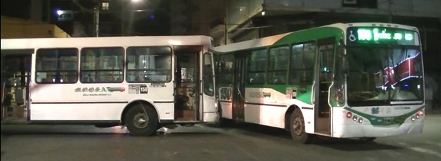 Dos internos de la línea 259 chocaron anoche en la esquina de Alem e Yrigoyen.
