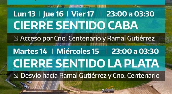 El cronograma de trabajos comenzará este miércoles 8 sentido a La Plata con cierres alternados que se realizarán de 23 a 3.30. Los cortes se extenderán hasta el viernes 17.