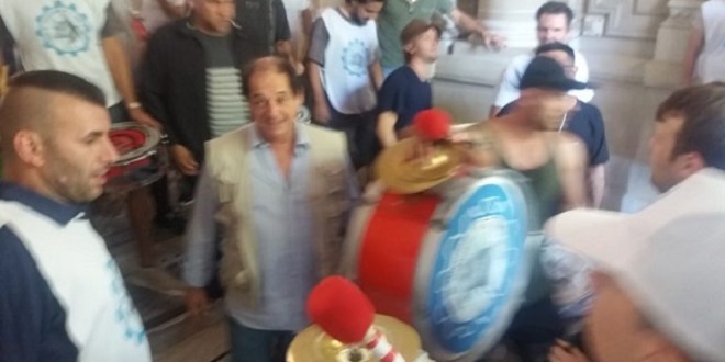 Quienes pasaban por las inmediaciones de la plaza San Martín, pudieron ver como se recreaba una manifestación encabezada por el Tigre Verón (Chavez) que irrumpía en la Municipalidad (Casa de la Cultura).