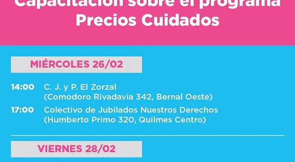 La Municipalidad de Quilmes continuará durante la próxima semana con el ciclo de capacitación sobre Precios Cuidados para adultos mayores en los Centros de Jubilados El Zorzal (Bernal Oeste), Nuestros Derechos (Quilmes Centro), 14 de Agosto (Quilmes Oeste) y Renacer en el Encuentro (Ezpeleta).