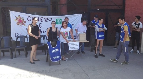 Empleados municipales despedidos instalaron una mesa con alcancías en la puerta de la Municipalidad y pidieron una colaboración económica mientras esperan que se resuelva su reincorporación.