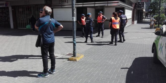 Personal policial recorre el Paseo Rivadavia y las adyacencias para exigir a los vecinos que respeten la cuarentena obligatoria.