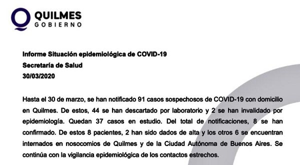 La Municipalidad de Quilmes informó que hasta el momento fueron 8 los infectados por el COVID-19 en Quilmes. Seis siguen internados en clínicas de Quilmes y CABA y dos ya fueron dados de alta.