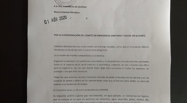 En el día de hoy, representantes de 35 organizaciones sociales, eclesiales, gremiales, políticas y barriales del municipio de Quilmes, entregamos en la Secretaría Privada de la Intendenta Mayra Mendoza una nota pidiendo la convocatoria a la conformación de un Comité de Crisis que multiplique y potencie la fuerza de la comunidad organizada para frenar los efectos de la pandemia.