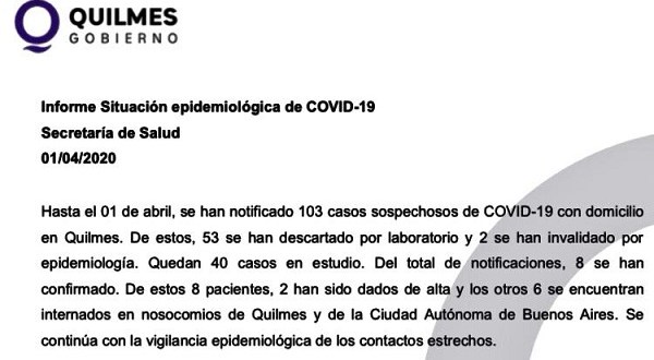 Hasta hoy, son 8 los casos de coronavirus confirmados en Quilmes de los cuáles 2 fueron dados de alta.
