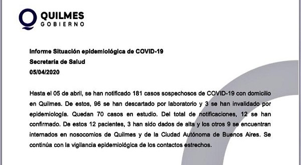 El Municipio de Quilmes informó que son 12 los quilmeños infectados con coronavirus de los cuales 3 ya han recibido el alta mientras que los 9 restantes están internados en clínicas de Quilmes y de CABA.