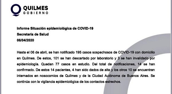 El Municipio de Quilmes informó que son 14 los quilmeños infectados con coronavirus de los cuales 4 ya han recibido el alta mientras que los 10 restantes están internados en clínicas de Quilmes y de CABA.