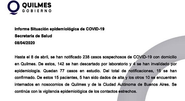 El Municipio de Quilmes informó que son 15 los quilmeños infectados con coronavirus de los cuales 5 ya han recibido el alta mientras que los 10 restantes están internados en clínicas de Quilmes y de CABA.