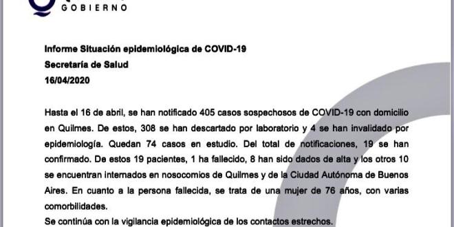 El Municipio de Quilmes informó que son 19 los quilmeños infectados con coronavirus de los cuales una falleció, 8 ya han recibido el alta mientras que los 10 restantes están internados en clínicas de Quilmes y de CABA.