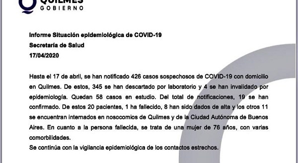 El Municipio de Quilmes informó que son 20 los quilmeños infectados con coronavirus de los cuales 1 falleció (una vecina de 76 años), 8 ya han recibido el alta mientras que los 11 restantes están internados en clínicas de Quilmes y de CABA.