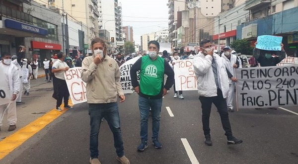 Trabajadores del Frigorífico Penta, con barbijos obligatorios, llegaron –cerca del mediodía- hasta el Puente Pueyrredon con la intención de cruzar a Capital y manifestarse en Plaza de Mayo.