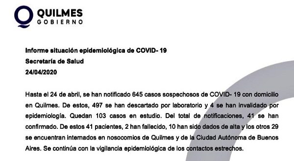 Hasta el momento son 37 los quilmeños infectados con coronavirus de los cuales 2 fallecieron (ambas mujeres), 10 ya han recibido el alta mientras que los 29 restantes están internados en clínicas de Quilmes y de CABA.