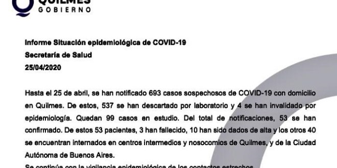 Hasta el momento son 53 los quilmeños infectados con coronavirus de los cuales 3 fallecieron (dos mujeres y uh hombre), 10 ya han recibido el alta mientras que los 40 restantes están internados en centros intermedios, clínicas de Quilmes y de CABA.
