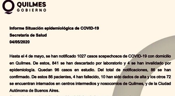 Según el reporte diario del municipio, hasta el momento son 86 los quilmeños infectados con coronavirus de los cuales 4 fallecieron (3 mujeres y un hombre), 10 ya han recibido el alta mientras que los 72 restantes están internados en centros intermedios, clínicas de Quilmes y de CABA.