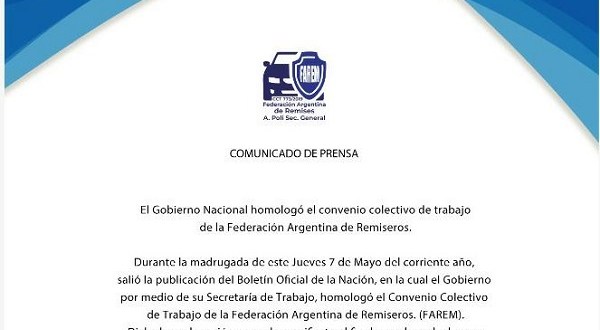 El Gobierno por medio de la Secretaría de Trabajo, homologó el Convenio Colectivo de Trabajo de la Federación Argentina de Remiseros. (FAREM).