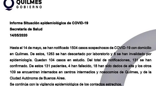 Hasta el momento son 131 los quilmeños infectados con coronavirus, 6 más que ayer, de los cuales 4 fallecieron (3 mujeres y un hombre), 18 ya han recibido el alta mientras que los 109 restantes están internados en centros intermedios, clínicas de Quilmes y de CABA.