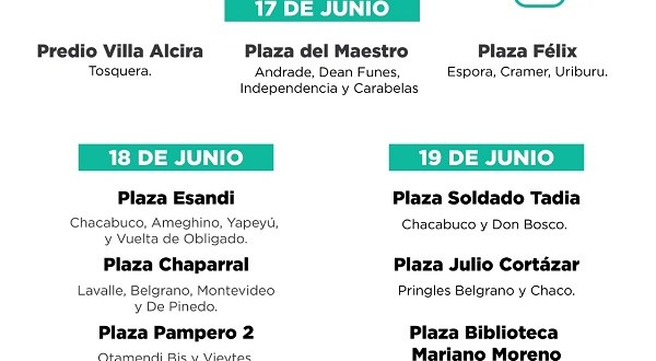 Mañana, también en Bernal, proseguirán los trabajos en las plazas Esandi (Chabacubo, Ameghino, Yapeyú y Vuelta de Obligado), Chaparral (Lavalle, Belgrano, Montevideo y De Pinedo) y Pampero 2 (Otamendi Bis y Vieytes). El viernes se trabajará en las plazas Soldado Tadia (Chacabuco y Don Bosco), Julio Cortázar (Pringles, Belgrano y Chaco) y José Pardo (Belgrano y 25 de Mayo).