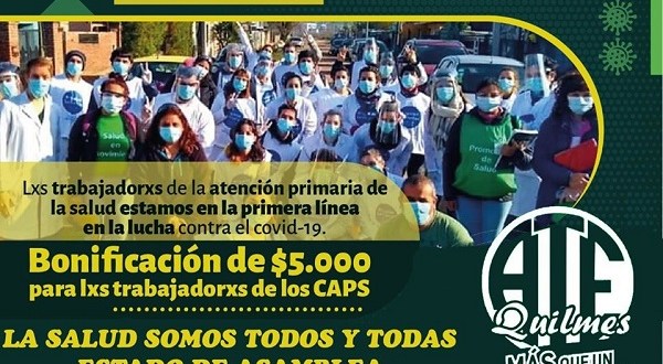 La Asociación de Trabajadores del Estado de Quilmes está en estado de asamblea permanente dado que los trabajadores de la primera línea de atención frente al COVID-19 no recibieron el bono de $20.000 (dividido en 4 cuotas de $5.000) que aseguro el Gobierno Nacional
