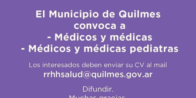 El Municipio de Quilmes, con el objetivo de fortalecer su sistema de salud y el de dar más y mejores respuestas a los quilmeños y a las quilmeñas, en el marco de la pandemia por el coronavirus, convoca a médicos y a médicas en general, y también a especialistas en Pediatría para sumarse a su equipo.