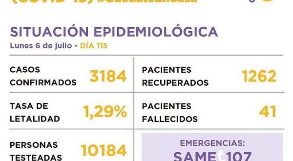 El reporte epidemiológico emitido por la Municipalidad indica que hay 2 nuevos fallecidos con lo que el total de victimas fatales es de 41 y la tasa de mortalidad es de 1,29%. En tanto 1.198 pacientes se han recuperado.