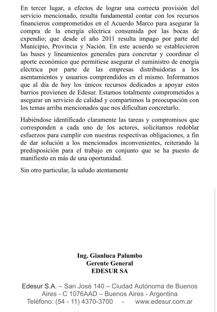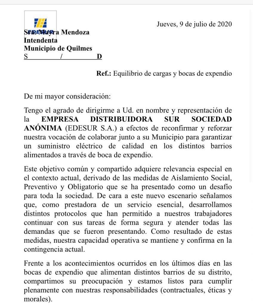 Edesur le respondió a la intendenta Mayra Mendoza que, para evitar los reiterados cortes de luz en distintos puntos de Quilmes, principalmente en los barrios populares, la municipalidad cumpla con el acuerdo marco para asegurar la compra de energía eléctrica.