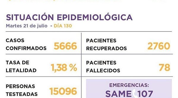 De acuerdo al informe emitido hoy por el Municipio, son 5.666 (191 casos más que ayer) los contagiados y 78 (4 más que ayer) los fallecidos. La tasa de mortalidad es del 1,38%.